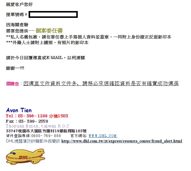 總之如果看到這個,根據指示,請打電話給DHL吧