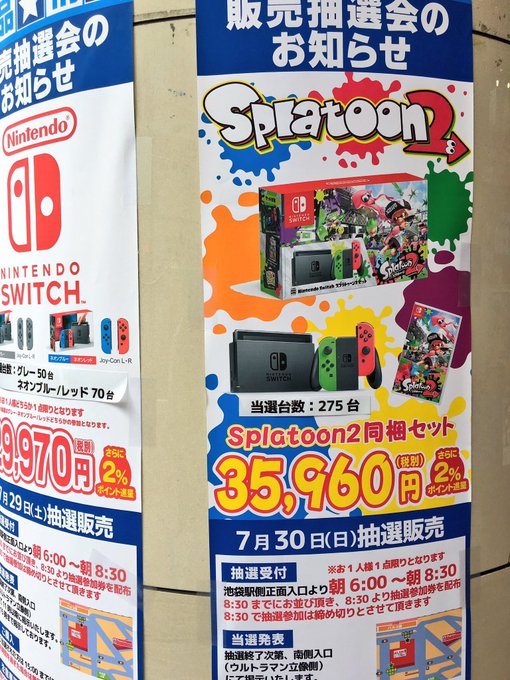 池袋のヤマダ電機LABIにて、明日7/30、かなりの台数のスプラトゥーン2同梱版の抽選販売会やるそうです!200台以上!普通のswitchの抽選販売もするみたいです!